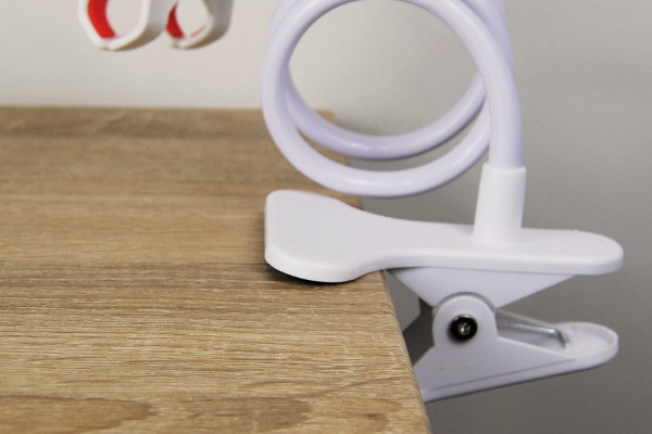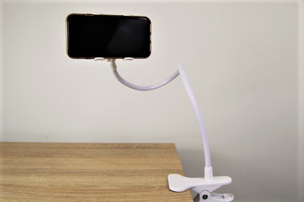 机に装着して使い心地を試していきましょう。思っていた以上にクリップの力が強力なおかげで、スマホをガッチリと固定してくれます。ヘッドをクルクル回転させると、360度の角度に調整可能。アームとヘッドで角度を調節すれば、寝ている状態でも動画を楽しむことができますよ。