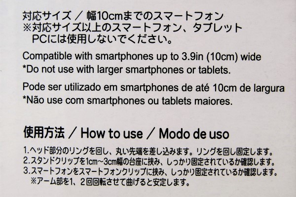 アームの長さは最大で約62cmほど。ヘッドの部分には横幅が約10cmまでのスマホを挟めます。なお、対応サイズ以上の端末やタブレットPCなどは使用できません。