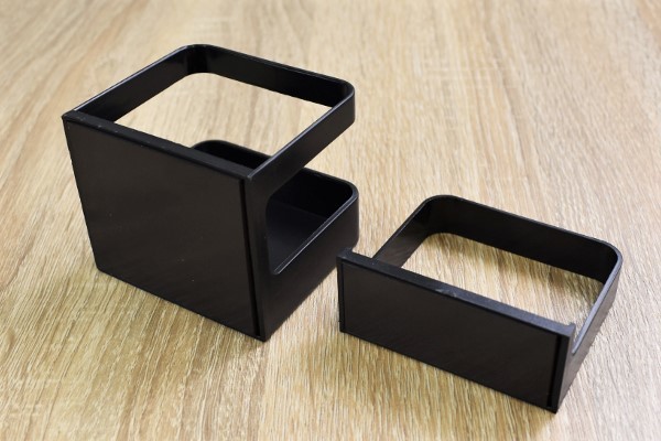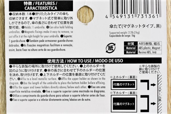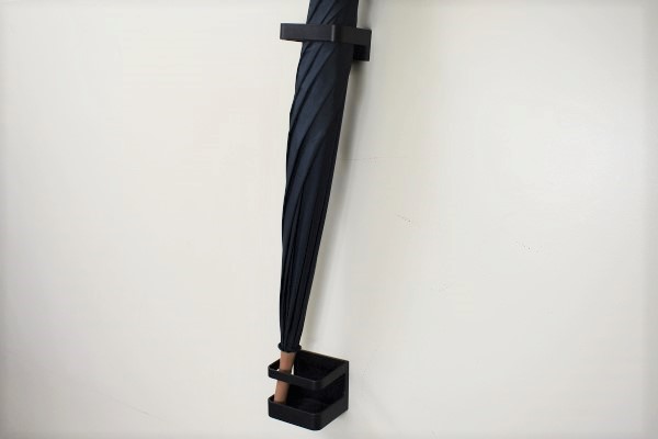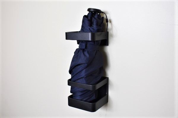 部屋の景観に合わせやすい、黒色のシンプルなデザインの同商品。素材にはABS樹脂が使われていて、傘の本体を支えるパーツと先端を乗せる部分の2つに分かれています。背面が磁石になっており、好きなところに貼りつけ可能。傘たての耐荷重量は約1kgと丈夫な作りなので、長めの傘でも安心して使えそうですね。
