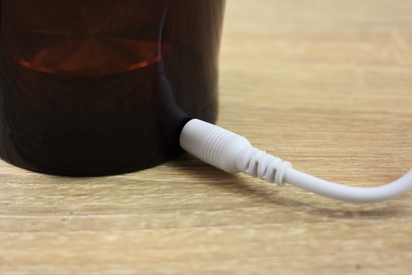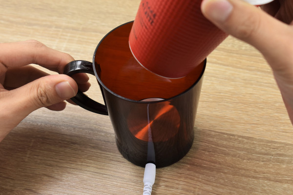 紙カップウォーマーの底には、銀色に輝く円盤が。どうやらこの部分が発熱し、飲み物を温かく維持してくれるようです。さっそく、用意していた紙カップに入ったコーヒーで試してみましょう。まずはUSBケーブルを接続し、スイッチを入れます。すると紙カップウォーマーの下部に、赤と緑のランプが点灯。続けて、コーヒーの入った紙カップを中に入れます。紙カップはすっぽりと収まり、底部に銀色のヒーターが密着しました。