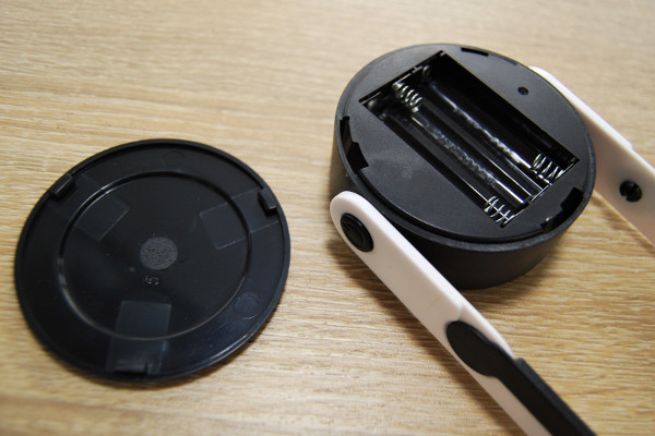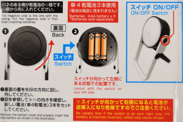 単4乾電池3本で使うことができ、ライトの連続使用目安時間は約6時間。ちょっとした明かりが欲しい時に十分な性能ですね。電池は付属していないので、あらかじめ用意しておきましょう。電池を取り替える際は裏側のフタを回して外すだけ。ドライバーいらずのうれしい仕様です。