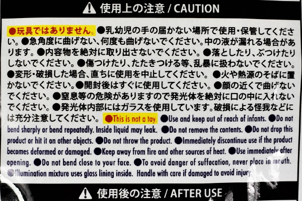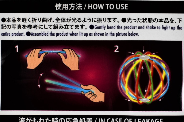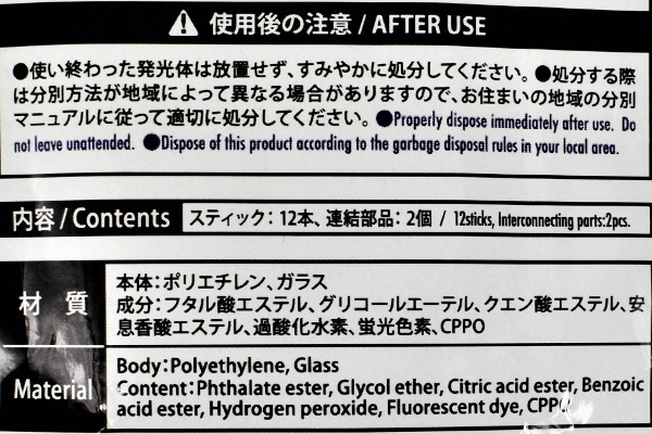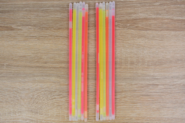 パッケージを開封すると12本のスティックと2つの連結部品が入っていました。スティックは軽く折ることで発光する仕組み。「赤・青・緑」といったカラフルな色が揃っていて、そのまま眺めているだけでもなかなかキレイです。