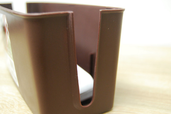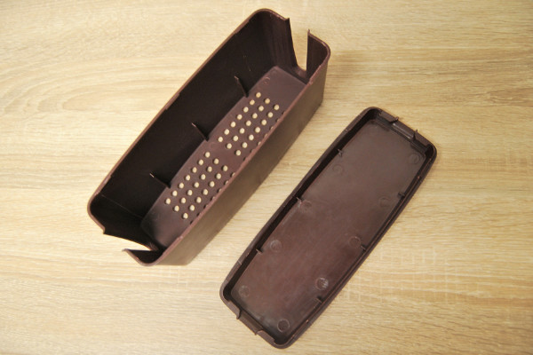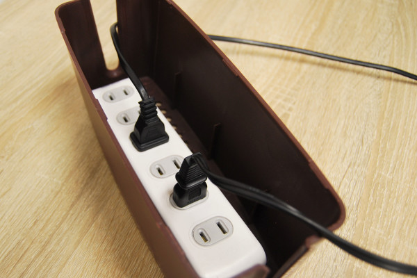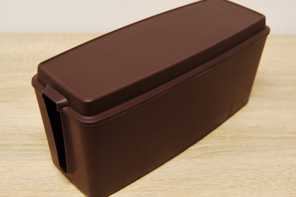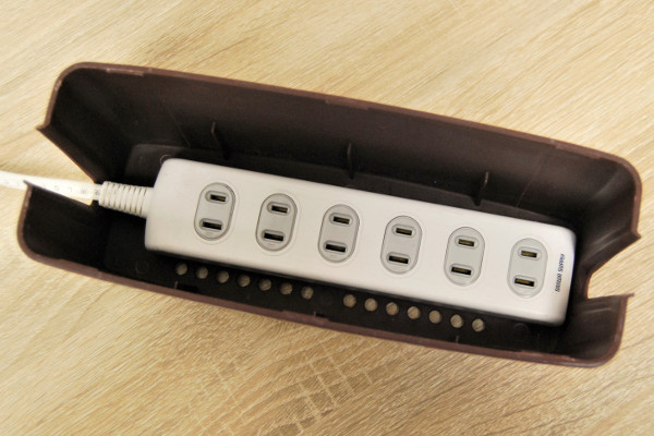 ポリプロピレンで作られた頑丈なボックス。落ち着いたこげ茶色のデザインで、部屋に置いても悪目立ちしなさそう。サイズは外寸88(縦)×232(横)×103mm(高さ)ほどと、幅のある作りです。両サイドにはケーブルを通すために縦長の穴が開いており、どちらからでもケーブルを出すことが可能。上部にはフタがついているため、充電中のスマートフォンなどを置くこともできますよ。底面は熱を逃す円形の穴がたくさん空いていて、安心度の高い仕様です。