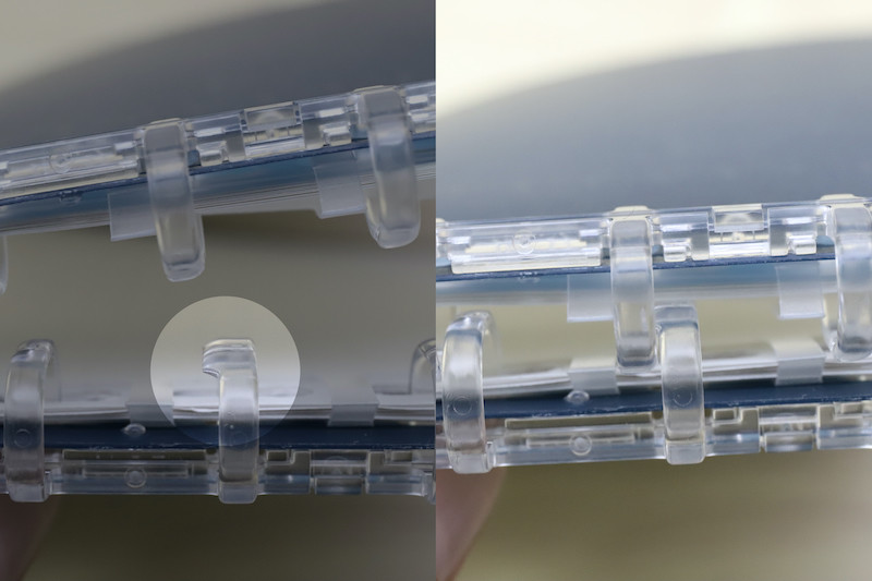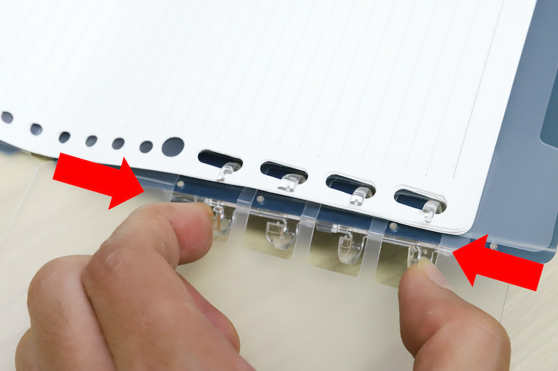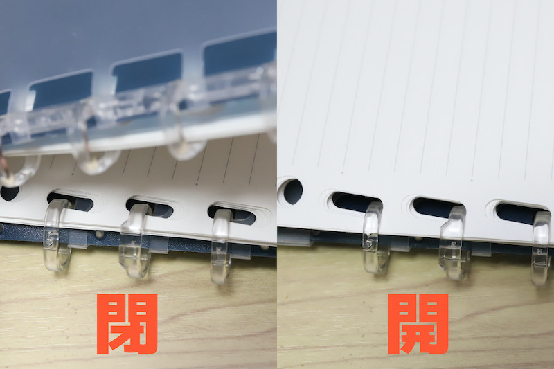 具体的には、上下4つずつのリングに入る穴が、ナナメになった楕円形で構成されている。これは、バインダーごと折り畳むと、紙の折れ厚によってリングから穴がズレ動いてしまうので、その移動分を吸収できるようになっているわけだ。