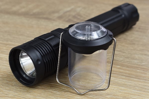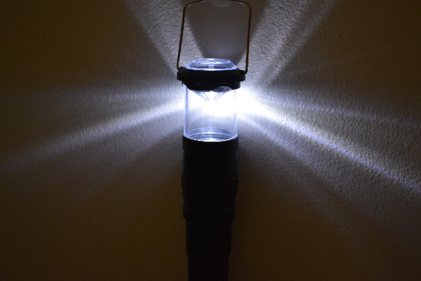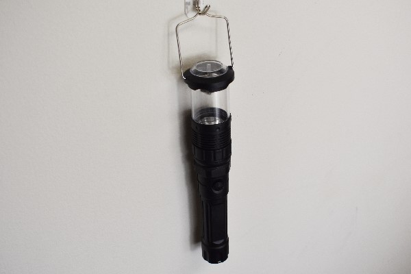 本体は、懐中電灯の先端がランタンになっていてちょっと変わった見た目。大きさは205(縦)×39mmφ(直径)ほどで、細身のボディです。重さも軽くて非常用の持ち出しバッグに入れても荷物になりません。先端のランタンは引っかけられる作りになっており、壁フックにかければ設置型ライトにできます。またランタン部分を取り外すと、普通の懐中電灯として使えますよ。