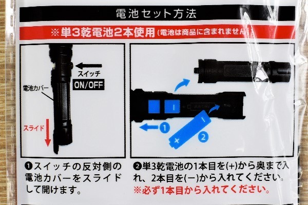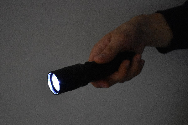 それではさっそく電池を入れて、ハンドライトのスイッチオン。ボタンをワンプッシュするだけで、手軽にオンオフを切り替えられます。電池2本でもLEDの明かりは強力。パッと室内が明るくなりました。連続点灯時間は約5時間とたっぷりあるため、非常時の明かりとして十分活躍してくれそう。いざという時のために用意しておけば心強いですね。