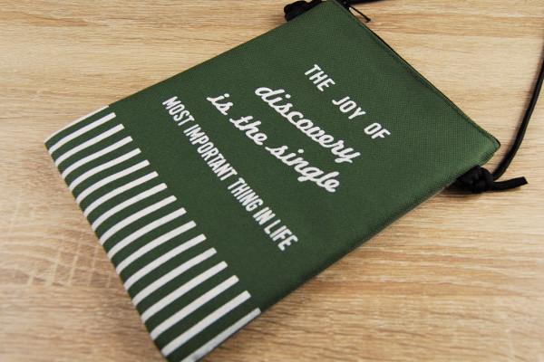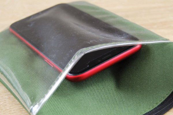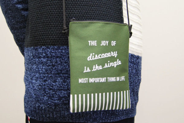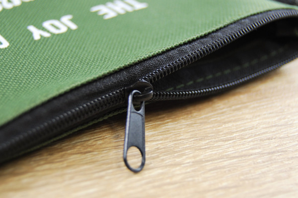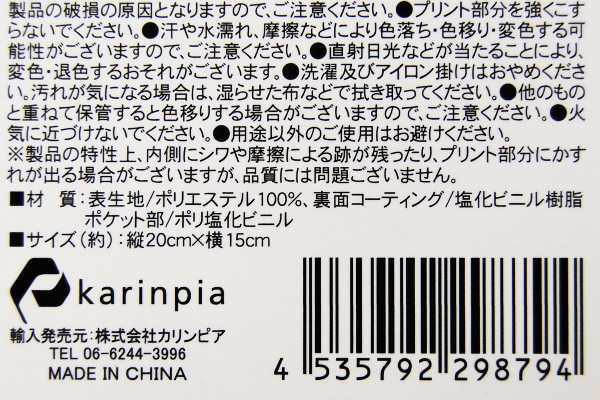 ポーチのサイズは約20(縦)×15cm(横)とコンパクト。上部はチャックで閉じられます。ポリエステル100%と塩化ビニル樹脂でできており、持ち運びに最適な軽さでした。抹茶色の生地に書かれた英字は、おしゃれなカフェ看板のよう。ついつい持ち歩きたくなりますよ。裏側の表面には、スマートフォンを収納できる透明なポケットがありました。