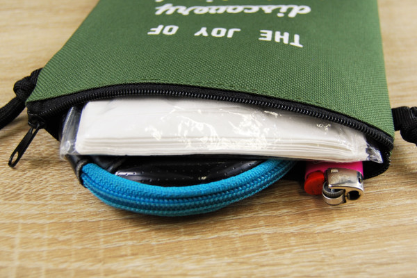 それではさっそくポーチを使ってみます。中は想像以上に広々。ティッシュやライターなど、常に持っておきたい小物をたくさん入れることができました。外側のポケットへは頻繁に使うスマホをIN。スマホのボディがすっぽりと入る深さなので、うっかり紛失する心配がなさそう。