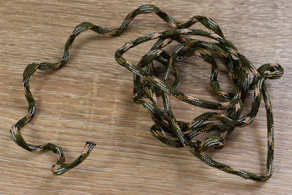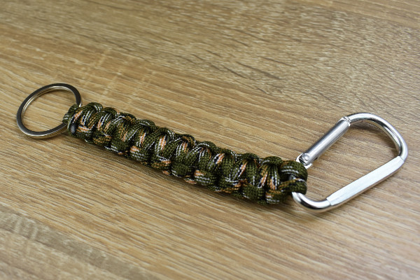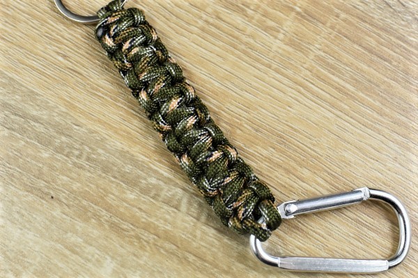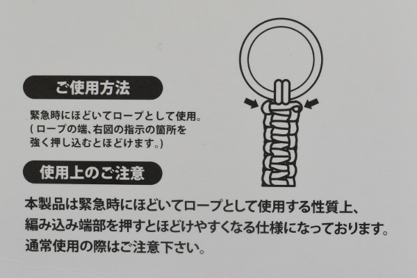 本体は迷彩カラーの紐を編み込んだ仕様で、両端にカラビナとリングがついていました。通常時のサイズは約18(高さ)×3cm(幅)。一見コンパクトですが、紐をほどくと約155cmのロープに大変身。約1kgまで耐えられる緊急ロープとして使えます。