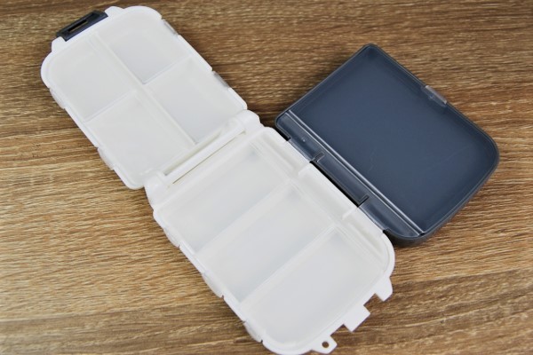 側面の留め具をパカッと外してみたところ、分厚いケースが平たいフォルムに変形。ケースの内部は7つの小窓で仕切られており、1週間分のお薬を曜日ごとに収納できる仕組みです。2段目のポケットには仕切りがなく、絆創膏や粉薬などを収納することも可能。お薬を飲まない場合、小物ケースとして活躍してくれそうですね。