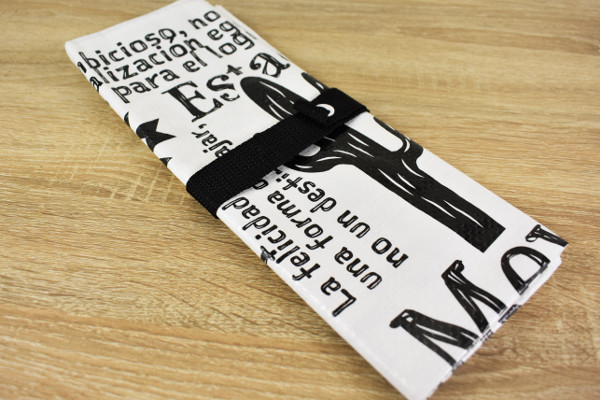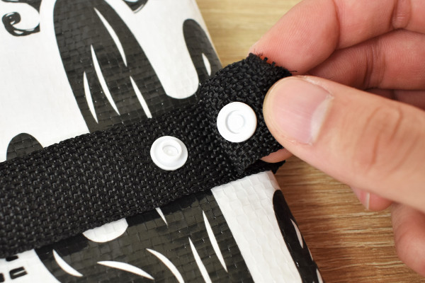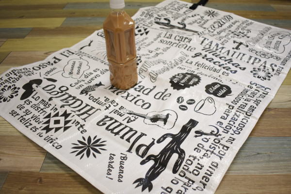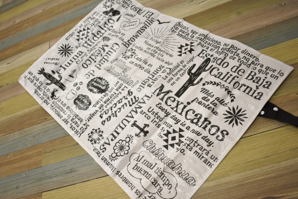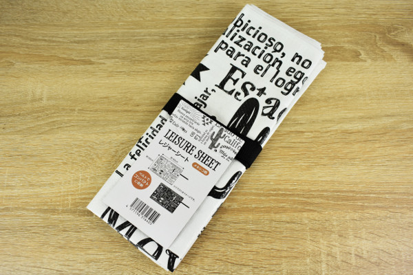 シートの端にベルトが付属している同商品。ベルトの白い留め具をパチッと装着すれば、シートをコンパクトに持ち運べます。試しに広げてみると、シートにはメキシコを連想させるサボテンやトカゲなどの模様が。全面にスペイン語がプリントされており、なんともスタイリッシュなデザインでした。