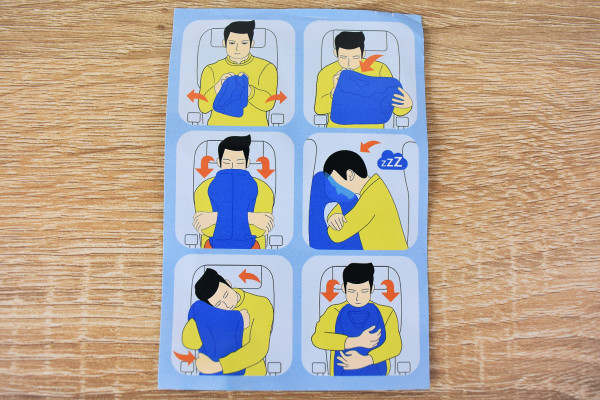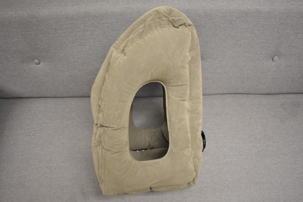 膨らませてみると、あっという間にビッグサイズのピローへと変身。サイズは約35×30×55cm(高さ)、重さ320gほどです。ふっくらした部分がやわらかく、なんとも抱き心地がよさそうな感触に。両サイドと正面にそれぞれ2つ穴があいており、穴の中は空洞になっています。まるで大きなリュックをくり抜いたようです。