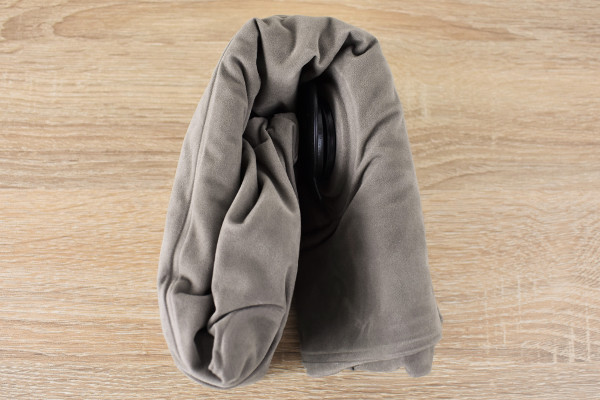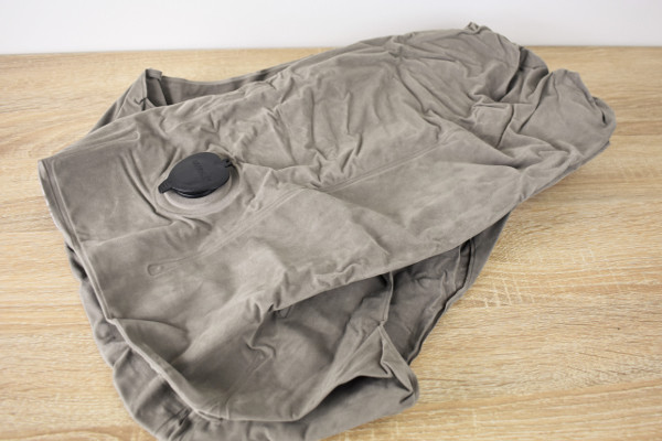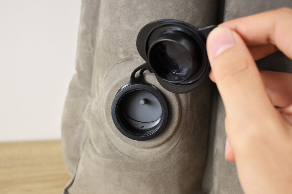 同商品は専用の収納袋にしまわれており、かなりコンパクト。袋を開封すると、折りたたまれたオリーブ色のピローが現れます。表面は肌触りがよく、サラサラとした触り心地。裏側には黒色の空気栓がついていました。空気を入れる際は、空気栓を開けてそのまま息を吹き込んでください。逆流防止弁が搭載されているため、途中で空気が抜ける心配もありません。