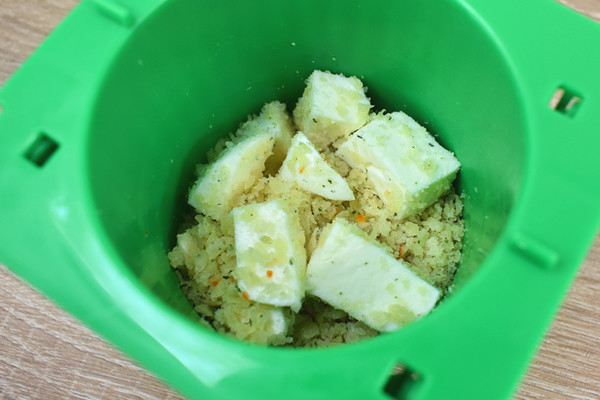 それでは、じゃがりっ粉を用意して「ハイパーじゃがアリゴ」をクッキング! じゃがりこを1個分入れてハンドルを回すと、ガリガリと音を立てながらあっという間にじゃがりっ粉が作れました。