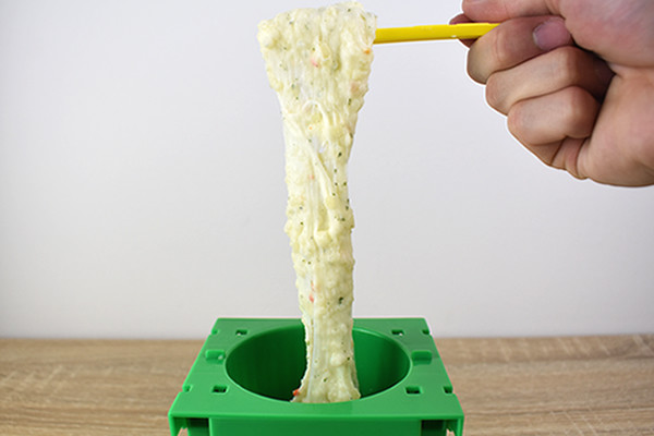 同商品は「球体じゃがりこ」や「生じゃがりこ」など、ユニークなメニューを調理可能。他にも、SNS上で話題になった「じゃがアリゴ」も作れます。じゃがアリゴは餅のように伸びるフランス料理“アリゴ”を再現したものですが、同商品で作る「ハイパーじゃがアリゴ」は“伸び”がさらにアップ。料理研究家かつYoutuberでもある「リュウジ」が考案しました。