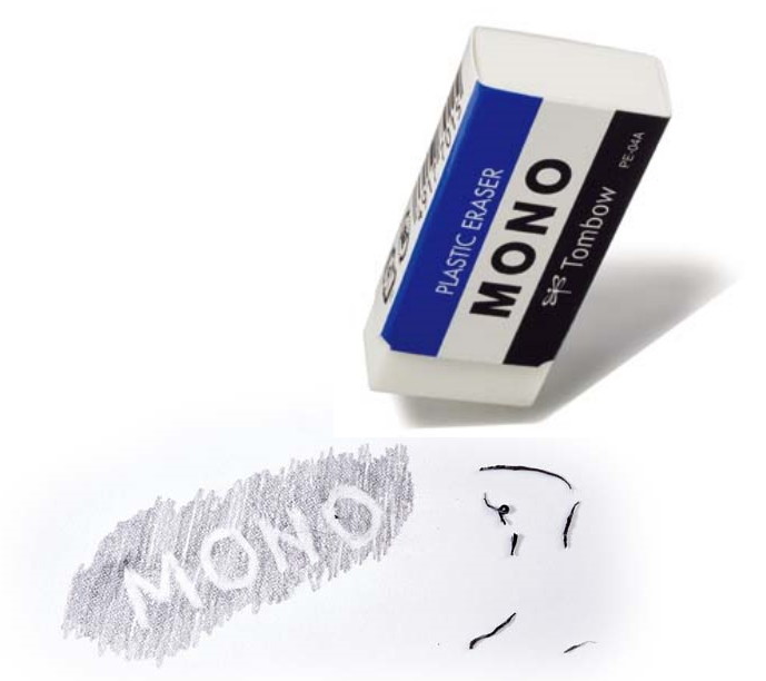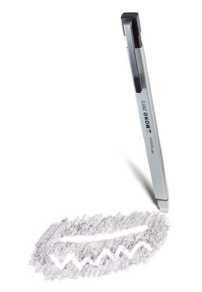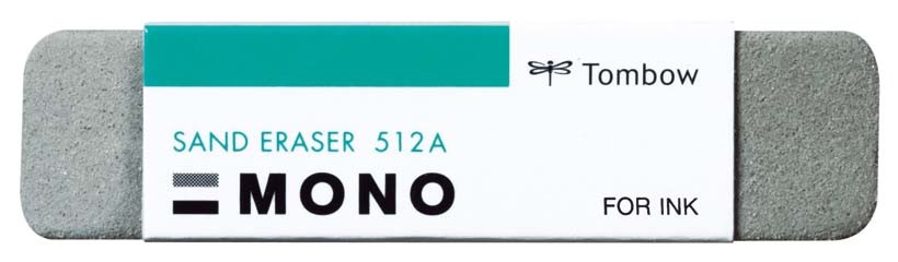 天然ゴムに硅石粉を混ぜ、ボールペンの筆跡や印刷の文字を紙ごと削り消します。片側が通常の消しゴムになった、「モノ砂ラバー消しゴム」もあります。