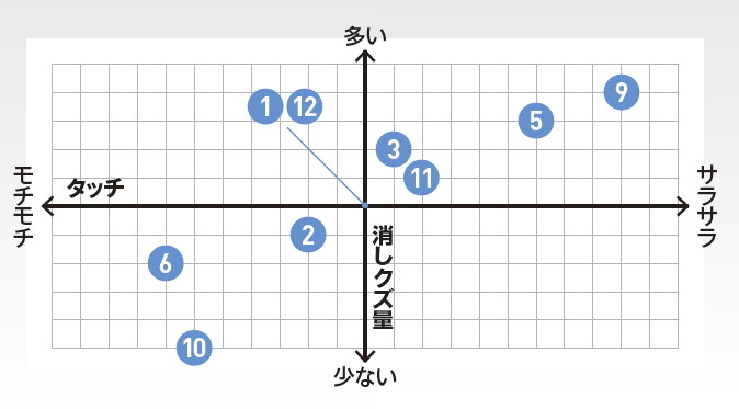 「鉛筆の筆跡を消す」だけとはいえ、消しゴム生地の性能と消し感は様々です。ここではホルダータイプ以外の鉛筆・シャープ用消しゴムを、消しクズの出る量と消しゴムの触感を定番のモノ消しゴムを中心に据えてマッピングしました。消しゴムを選ぶ際の参考にしてみてください。