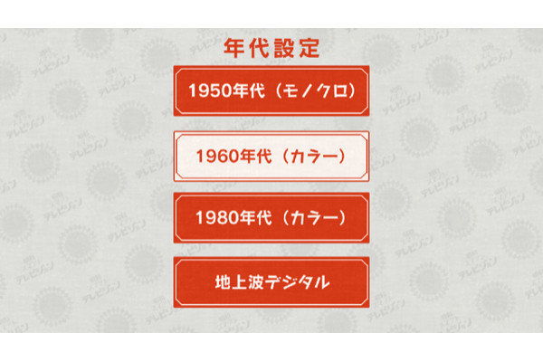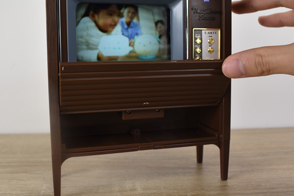 メイン画面で登録した動画(チャンネル)を選び、画面サイズや音量を調整すると動画がスタート。1960年代(カラー)の画面は若干乱れていますが、なんともノスタルジックです。金色のダイヤルを回すと別のチャンネルに切り替えることもできました。しかし、鑑賞を続けているうちに画面へ砂嵐が現れ、動画が見られない状態に。そんな時はテレビの天面を叩いてみましょう。昭和時代に多くの人が体験した作法で、画面の乱れがすぐに収まりますよ。ちなみにテレビ画面の下側には収納スペースがあるので、小物入れとして使ってもよさそう。