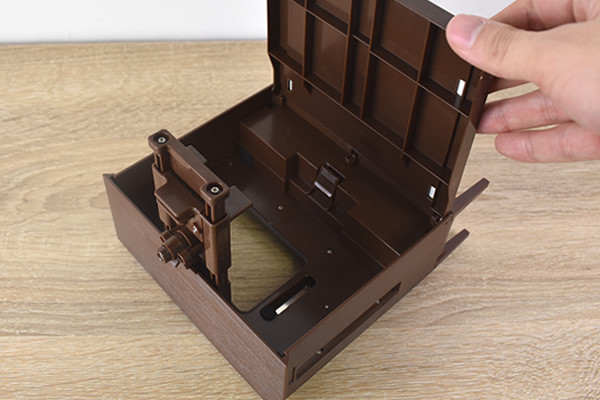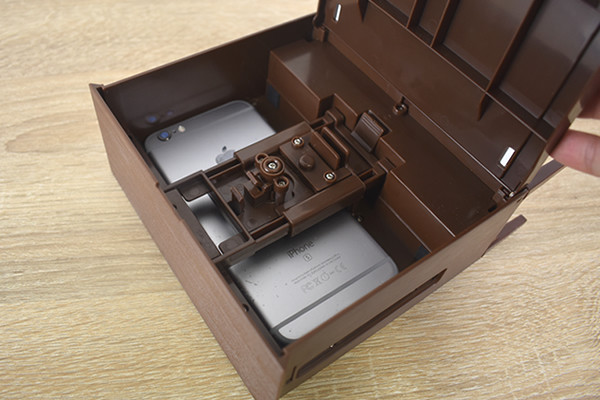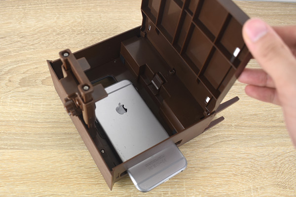 本体のセット方法は、まず背面のフタを開いて“ガイドレバー”を持ち上げます。次にスマートフォンをセットし、ガイドレバーを下げてください。あとはツマミなどでスマートフォンを固定するだけでOK。