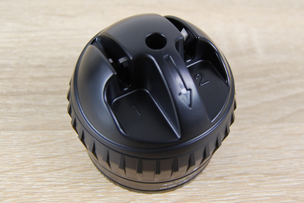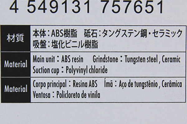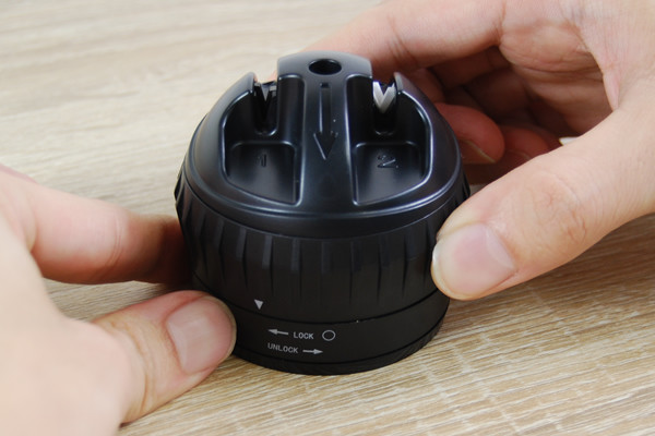 黒い球体のようなフォルムをしている同商品。約6(直径)×6.2cm(高さ)ほどの大きさで、とてもコンパクトなサイズ感です。包丁を研ぐ部分は、“粗研ぎ”と“仕上げ研ぎ”の2か所に分かれていました。ちなみに両刃包丁専用となっているため、片刃の包丁は使用できません。