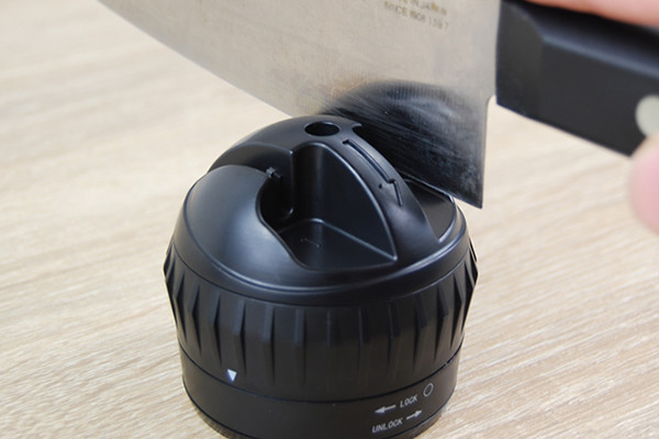 それでは、さっそく包丁を用意して実証スタート。底面に“吸盤ロック”がついており、側面のダイアルを回せばガッチリ固定されます。引っ張っても取れる気配がないので、安定した状態で包丁を研げるはず。