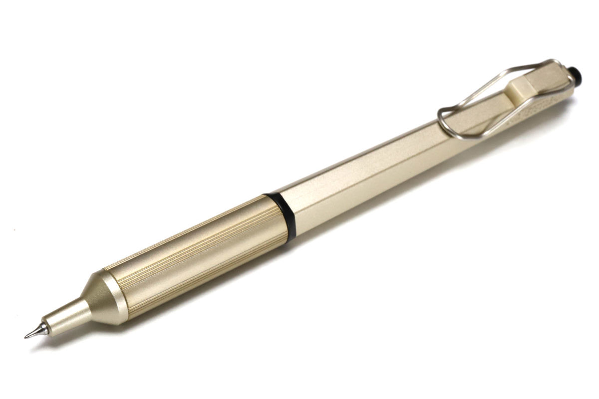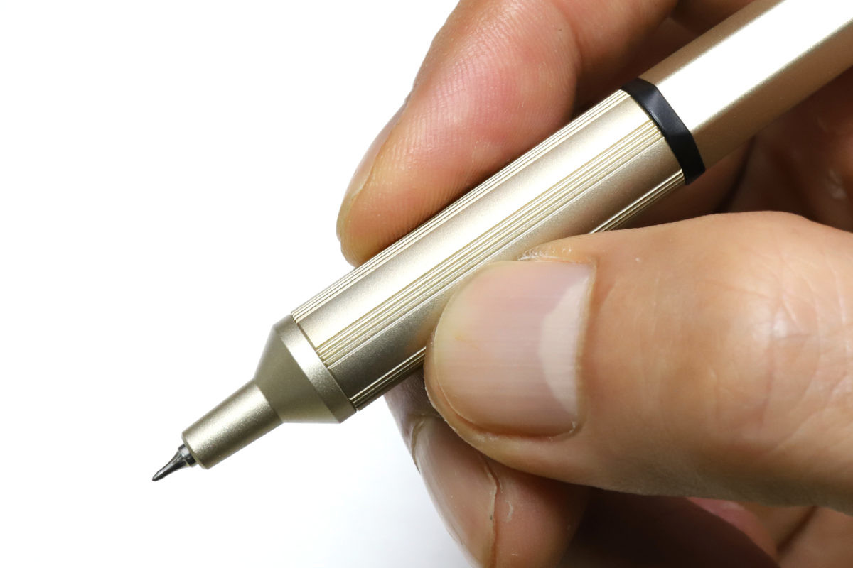 シャープなイメージと、握りやすさ・細字の書きやすさという機能面を両立させて、かつカッコイイ。見た目だけでも所有欲をくすぐられる、なかなか優秀なデザインだと思う。