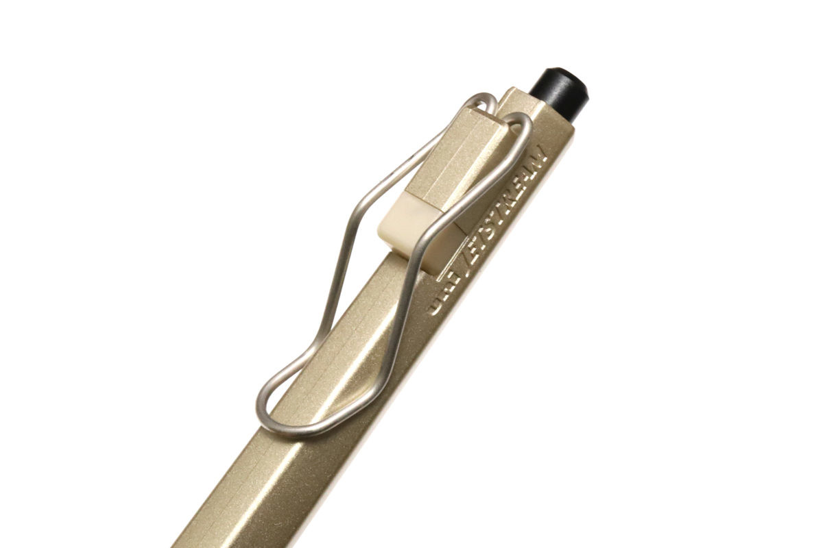 トーションバー(ねじり棒)機構を使ったクリップは、超極細の筆記線をイメージしたとおぼしき細いワイヤータイプで、確実にポケット端や手帳に固定できるよう、折り曲げた部分に圧を集中させる構造だ。
