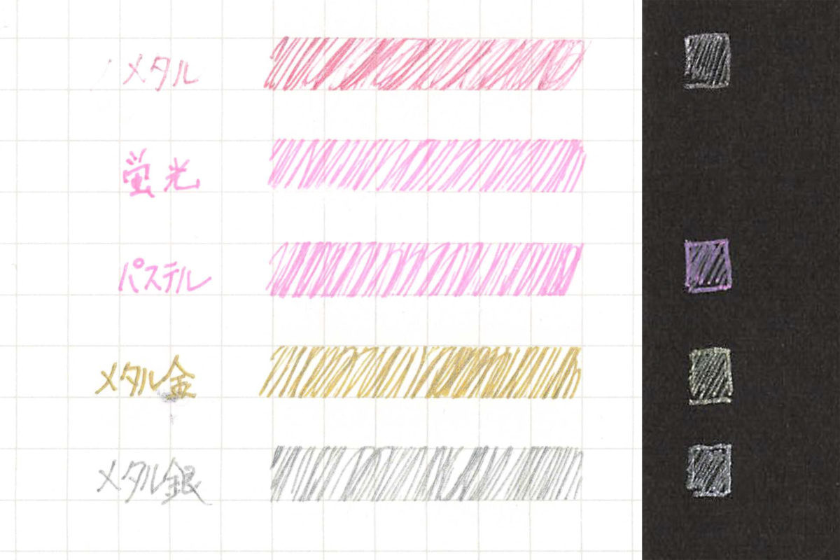 黒い紙に書いてもくっきりきれいなパステルカラーも面白い。つい先日も、 1990年代に人気となったパステルカラーペン「ハイブリッドミルキー」(ぺんてる)が復刻されて話題になっているが、コレトのパステルカラーも負けじと良い発色。メタリックカラーと合わせれば、みっちり描き込んだコロリアージュ(大人向けの塗り絵)や手作りカードなどに威力を発揮するだろう。
