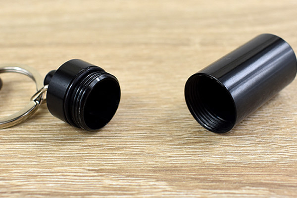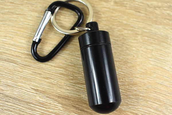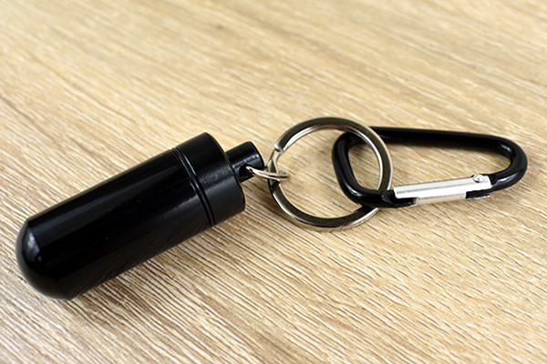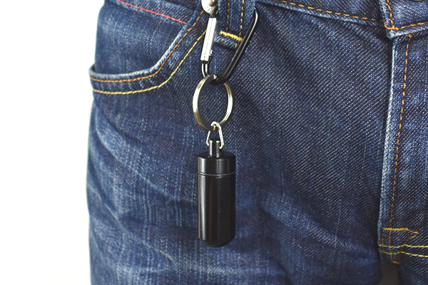 まずはじめに注目したのは、カラビナに連結された黒いミニカプセル。ミステリアスな雰囲気を醸し出しており、男心を揺さぶられます。ちなみにカプセルは4.8cmぐらいの大きさで、カナビラを含めた全長は約10.5cmほど。カプセルはフタを回せば、中に小物を入れることができますよ。