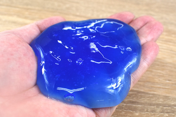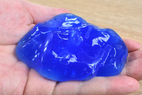 パッケージから取り出すと、ブルーカラーが色鮮やかなジェルがお目見えします。触り心地は“ムニュ”っとしており、まるでスライムみたい……。