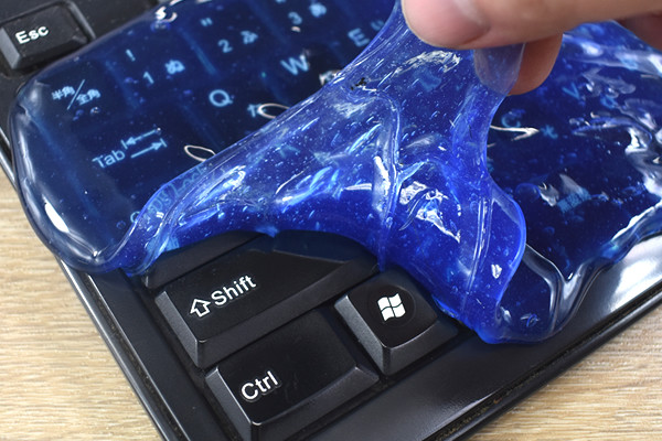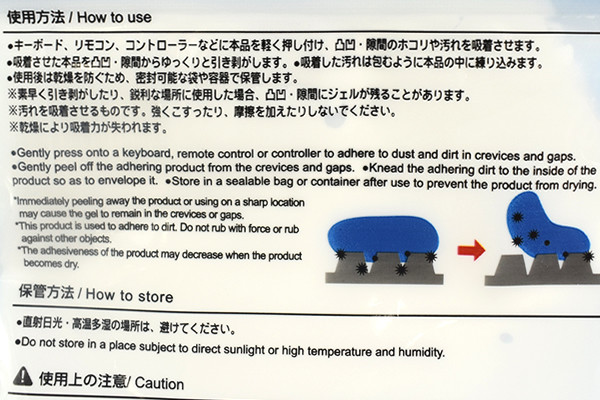 使い方はまずキーボードやリモコンなどに同商品を軽く押しつけ、ほこりや汚れを吸着させます。あとはゆっくりと引きはがすだけでOK。吸着した汚れは、包むようにジェルの中に練り込んでください。