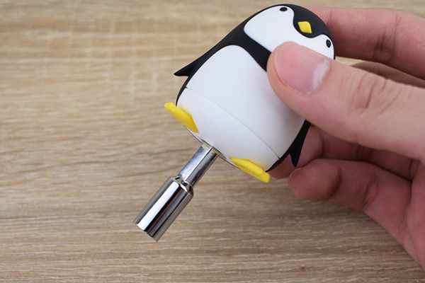 まずはペンギン本体を取り外すと、本体を留めていた延長バーの頭が氷山の中心に出現。指で押すと氷山から延長バーが取り出せるので、延長バーをペンギン本体に装着します。ペンギン本体はマグネットつきのグリップになっていて、延長バーは吸いつくようにカチッと装着できました。