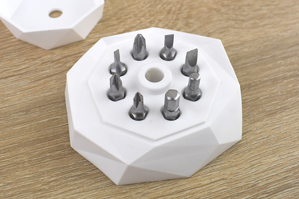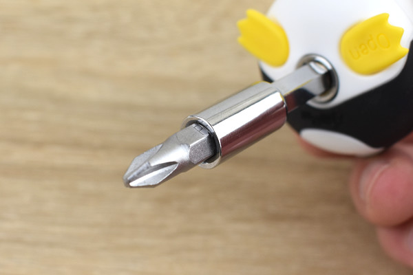 延長バーを取り外した氷山のフタを外すと、マイナス・プラスドライバー大中小各3本と六角レンチ大小2本合わせて8本のドライバーヘッドがずらり。用途に合ったビットを抜き取ったら、延長バーの先端に装着します。延長バーもマグネットになっているので、ペンギン本体から延長バーやビットが落ちることはありません。これでペンギン本体をグリップにしたドライバーが完成。ちなみにビットは延長バーがなくてもペンギン本体へ装着可能です。