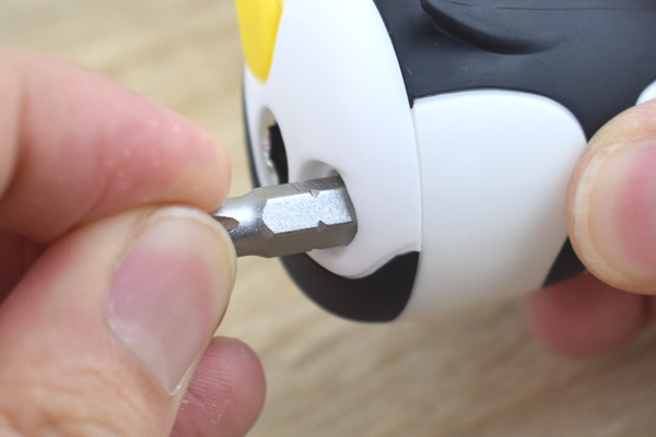 ペンギン本体にはさらに秘密が。本体内に6本分のビット収納スペースがあり、足を外して下半身を回転させて収納場所を選べます。例えば大中小のプラスドライバーを収納しておけば、ネジの十字穴に合ったサイズをその場で選べますね。