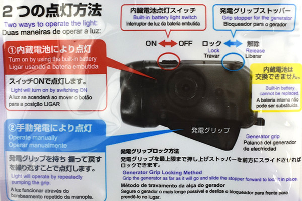 手動発電の場合は発電グリップストッパーを解除し、“握る・戻す”を繰り返している間LEDを点灯させることができました。