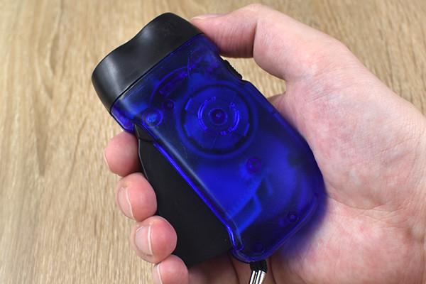 同商品は名前に“手動発電”とありますが、実は電池も内蔵した2通りの点灯方法を採用。手に持ってみると片手で持つのにピッタリなサイズで、ストラップもついているため手首に通しておけば落としてしまう心配もなさそう。