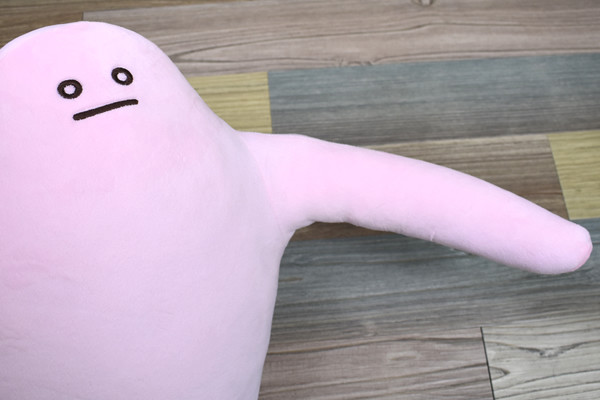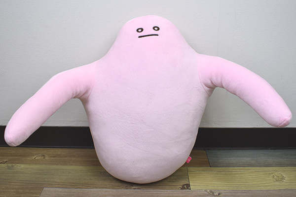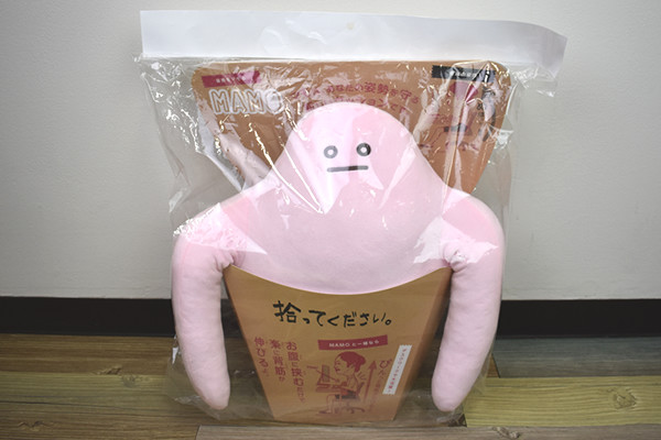 ボックスの中にピンク色のクッションが入った同商品。クッションは「マモ」という名前で、とてもゆる~い見た目をしています。楕円形っぽい胴体に細長い腕が伸びており、顔にはちっちゃな目と口が。ボックスに「拾ってください」と書いてあるのが、なんともシュールですね。なおマモのサイズは約40(全長)×70(胴囲)、重さは300gほど。