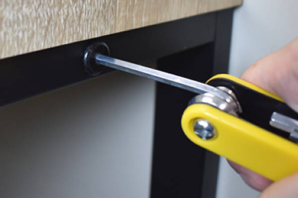実際にちょっとガタガタする机のネジを締めてみます。まず合うサイズのレンチ探しから始めましたが、1つにまとまっているため難なく発見。続いて6角棒で回して、緩くなったネジを締め直しました。締める際は、本体から他の6角棒が出てこないように手でカバーしながら使うのがコツです。
