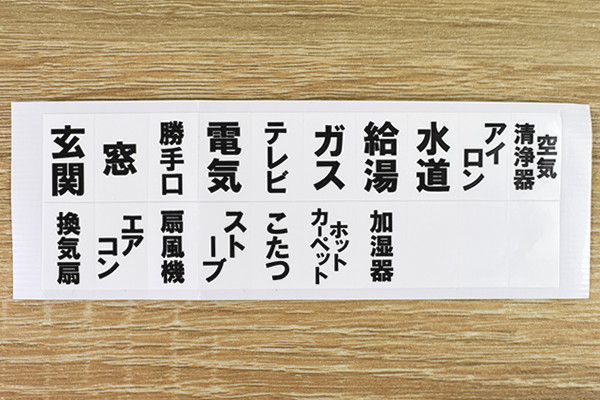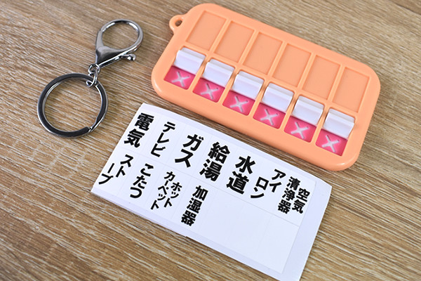 チェッカー以外にも、キーホルダーと項目シールが付属していました。キーホルダーをチェッカーの端部につけると、様々なアイテムに装着可能。シールは「電気」「玄関」といった主要なものから、「こたつ」「ストーブ」などの細かい項目まで選べます。全部で17種類ありますが、自分で書き込める“フリー項目”も用意されているのはありがたいですね。チェッカーにはシールを6か所貼れるので、忘れやすい項目をチョイスしてください。