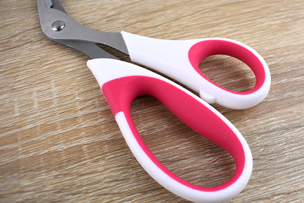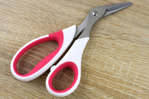 白色とピンク色のハンドルが可愛らしい同商品。普通のハサミとは違い、刃が斜めになっているのが特徴です。サイズは全長約18cm程度。ハンドルはポリプロピレンや熱可塑性ゴムで作られており、握り心地はなかなかでした。