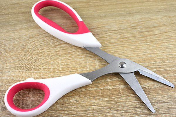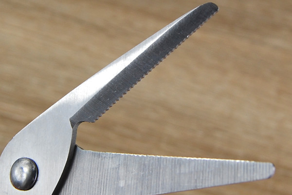 ハサミをよく見たところ、ステンレス製の刃がノコギリみたいにギザギザしています。どうやらノコギリ刃には滑り止めの役割がある模様。見た目は鋭そうですが、100円なので本当に切れ味がよいのか気になるところです。