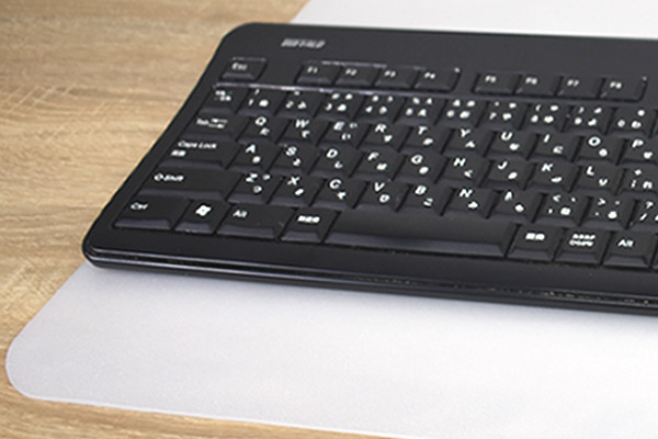 「デスクマット」には、キーボードやマウスパッドなどのズレを防ぐ“すべり止め加工”が施されています。サイズは45(横)×41cm(縦)。実際にキーボードを置いてみたところ、スペースにかなりの余裕がありました。また手と腕がデスク表面に触れないため、汗などの汚れも簡単に防げるはず。