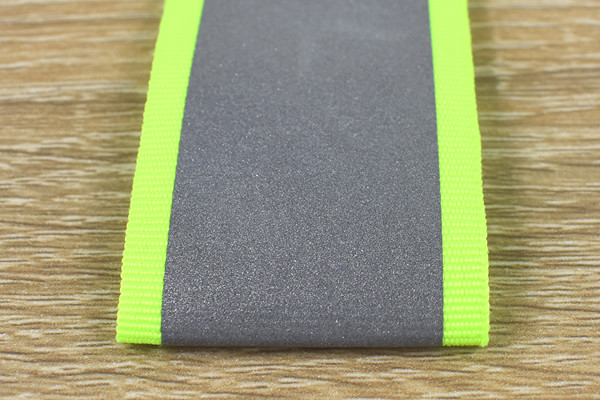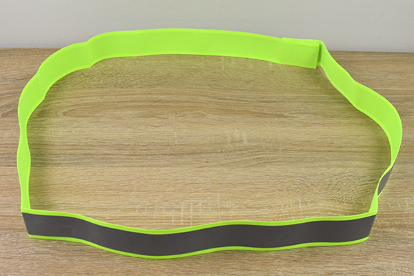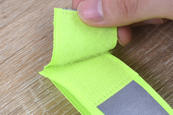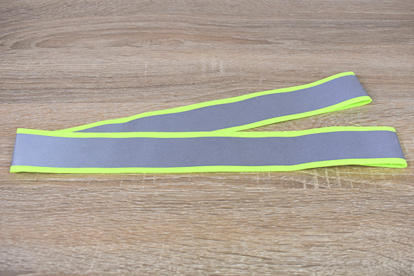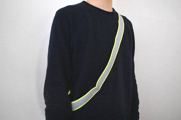 同商品は長さ約140cmのタスキ。デザイン自体は反射テープを明るい蛍光イエローの素材で縁取った、オーソドックスなタイプです。何度でもはがせるワンタッチテープ式なので、着脱がとてもラクチン。出かける時に面倒な前準備は避けたいので、ここは個人的に高ポイントかも。