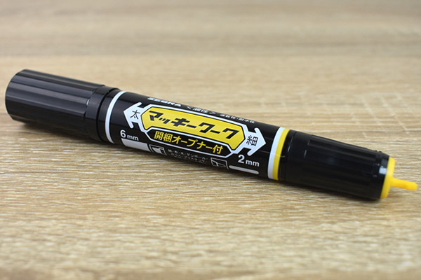 サイズは148mmほどで、同社から発売されている油性マーカー「マッキー」とほぼ変わらない大きさ。やはり最大の違いは、細字キャップ先の黄色い開梱オープナーでしょう。段ボールを閉じたガムテープをカットして開梱するプラスチック製のオープナーをつけることで“書く”と“開ける”を1本で実現したのが特徴。ちょっとしたアイデアですが、ありそうでなかった商品ですね。
