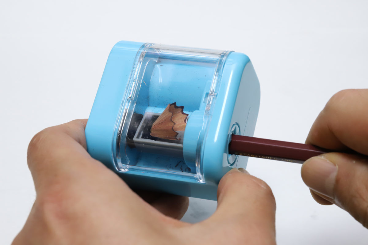 実際に削ってみると、確かに速い。丸まった鉛筆をグッと差し込んで、一拍おいて取り出したら、もうピンピンに尖っている。電池式の鉛筆削りでこの速さは、ちょっと笑ってしまうレベルだろう。
