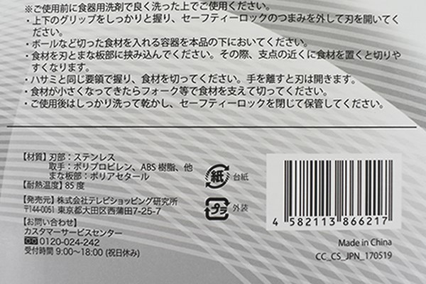 銀色のカッター刃はさびにくいステンレス製です。きゅうりなどの細長い食材だけでなく、じゃがいものような大ぶりの野菜もカットできる模様。まな板の部分はポリアセタール、取手はポリプロピレンやABS樹脂で作られていました。