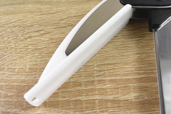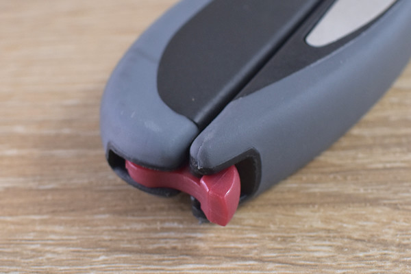 ハンドル部分をよく見てみると、バネのようなパーツ「パワープレッシャーハンドル」がついています。野菜を切る際に手の負担が軽くなる装置で、閉じたカッター刃を開いた状態に戻してくれるそう。ハンドルの端部には赤色のセーフティロックを搭載しているため、カバンやキッチン棚などへ収納する際にとても便利です。