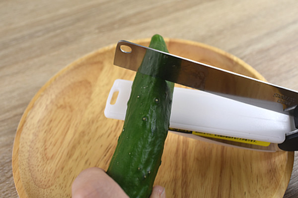 試しにきゅうりを切ってみると、ハサミと同じ感覚でスムーズに切れました。力は必要なく、連続でカットしても手の疲れはほとんど感じません。簡単なメニューであれば、まな板や包丁を使わずに調理できるはず。ちなみに刃とまな板は分離可能なので、使い終わったら食器用洗剤できれいに洗ってください。