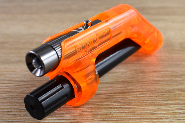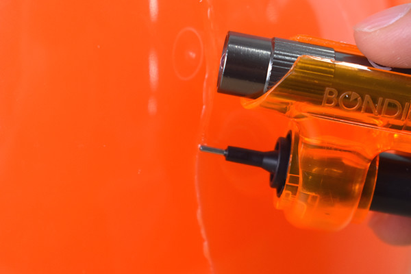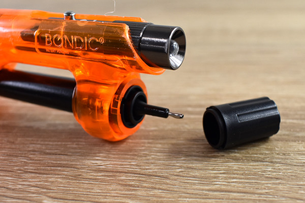缶ケースに入った同商品のフタを開けてみると、「BONDIC」本体とサンドペーパー、説明書が登場。オレンジカラーの「BONDIC」は、どこか近未来的なフォルムをしておりワクワクしてきます。サイズは約10cmほどで、手のひらに収まるサイズでした。