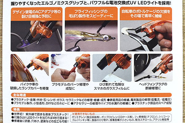 それでは液体プラスチックを塗布した部分に紫外線ライトを当てていきます。4秒以上ライトを当ててみましたが見た目的には特に変化ナシ。おそるおそる接着部を触ってみたところ、見事に固まっていました。爪ではがそうとしても、はがれる気配は一切ありません。